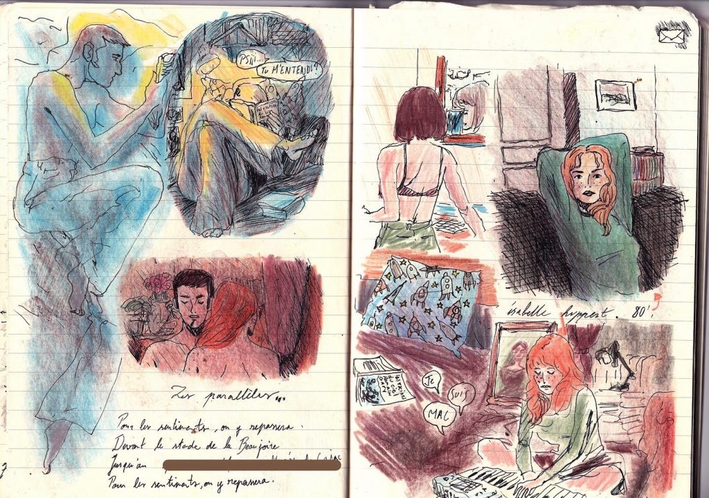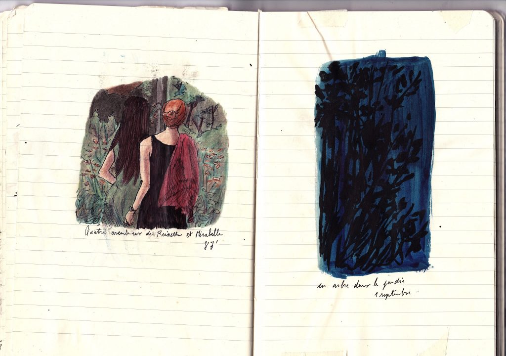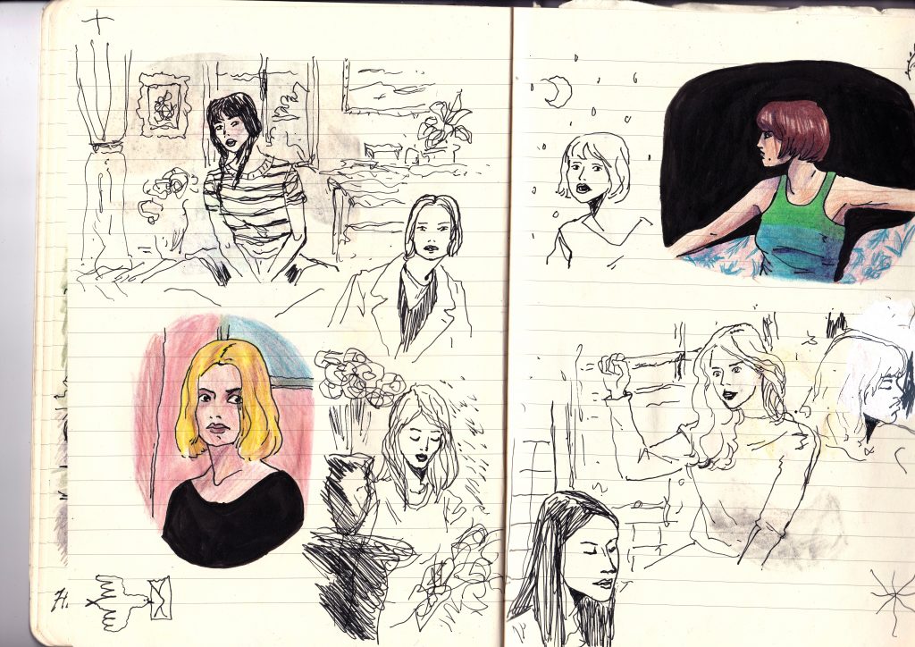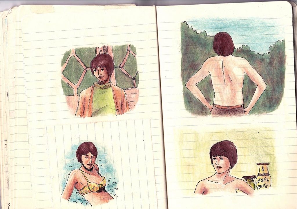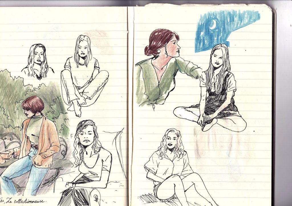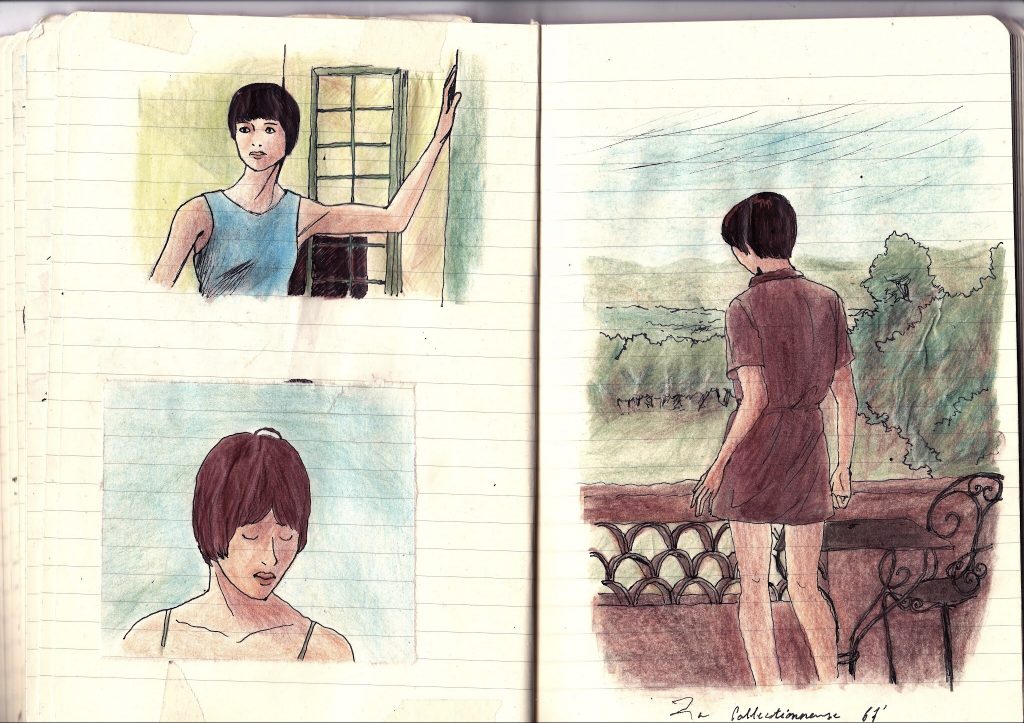 Recerches illustratives dans le sud de la France, inspiré des films de Rohmer. Crayons de couleurs, stylo-plume.