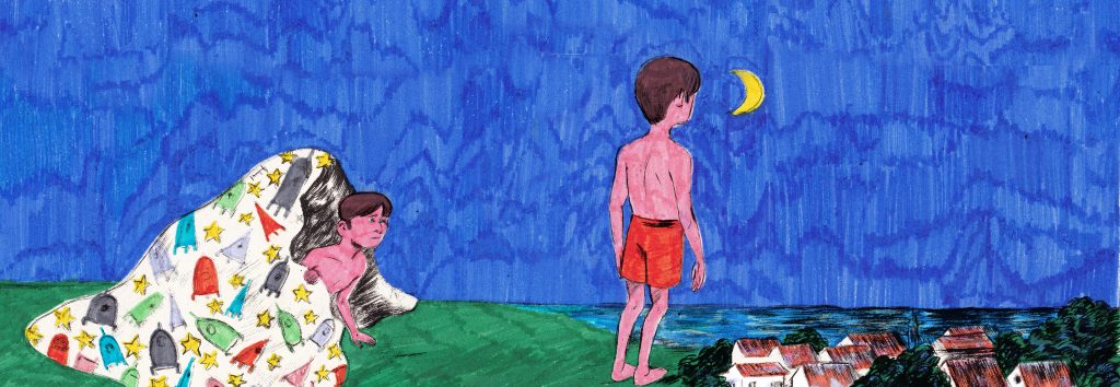 Illustrations sur l’errance d’un enfant qui ne trouve pas le sommeil. Dans le cadre du concours jenesse de Bologne. Encre de chine, pinceau, stylo feutre.